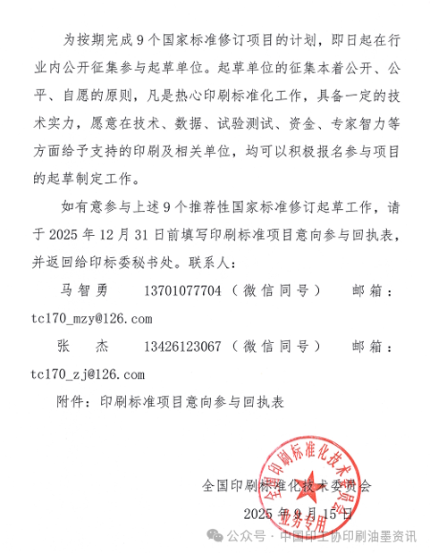 起草單位征集本著公開、公平、自愿的原則,凡是熱心印刷標準化工作,具備一定的技術實力,愿意在技術、數據、試驗測試、資金、專家智力等方面給予支持的有關企業或科研機構、院校,均可報名參與標準起草制定工作。如有參與意向,可咨詢中國印工協印刷油墨分會或全國印刷標準化技術委員會,并于2025年12月31日前填寫印刷標準項目意向參與回執表,返回至印標委秘書處。