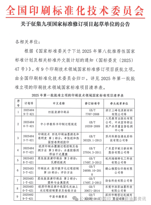 2025年9月15日,全國印刷標準化技術委員會發布公告,根據《國家標準委關于下達2025年第八批推薦性國家標準計劃及相關標準外文版計劃的通知(國標委發〔2025〕47號)》,有9個印刷技術領域國家標準修訂項目獲批立項。在9個國家標準修訂項目中,中國印工協印刷油墨分會有三家會員單位牽頭起草修訂工作,分別是蘇州科斯伍德色彩科技有限公司、杭州海維特化工科技有限公司和東莞市浩彩油墨科技有限公司,需要修訂的三項國家標準均是十年前制定,經復審后有的標準可能因技術內容落后、指標缺失或實施年限過長等原因,需要及時更新或補充完善。國家標準修訂有助于提升產品質量,滿足市場需求,進而提升行業競爭力。