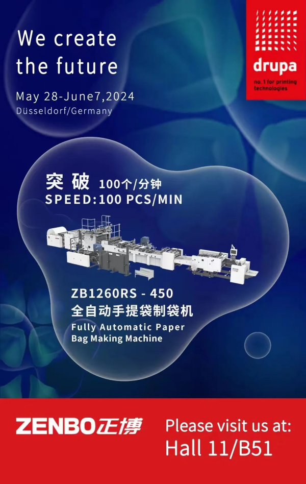 本次德魯巴展會,正博共展出了三款設備,其中兩臺均為全球首發,分別是環保袋嵌入式連線放底卡紙袋機、ZB1200CT-430ESF全伺服智能制袋機,此外還有一臺ZB1260RS-450全自動手提袋紙袋機,這款設備雖然不是全球首發,但也帶來了顛覆性的提升,速度已突破100個/分鐘。