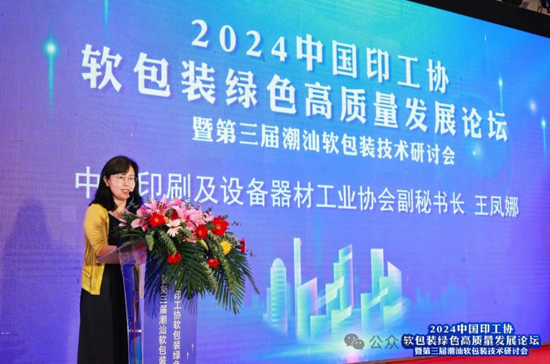 中國印刷及設備器材工業協會副秘書長王鳳娜亦發表致辭。王鳳娜表示:“潮州一直被稱之為美食之都,本次活動得到了行業各個單位的大力支持,旨在探討行業高質量發展之路,不僅承載著期待與使命,更有融合共生的責任。面對全球產業鏈深度調整,以及環保法規愈加嚴格、消費者需求多元化等挑戰,高質量發展是企業的必然選擇也是行業的必然趨勢。2024年是新中國成立的75周年,是實現“十四五”規劃目標任務的關鍵一年,也是軟包裝行業邁向高質量發展的新節點,希望大家能借助這一高端對話平臺,實現產業鏈協同發展,把握新機會,共繪新藍圖。最后,預祝大會圓滿成功。”