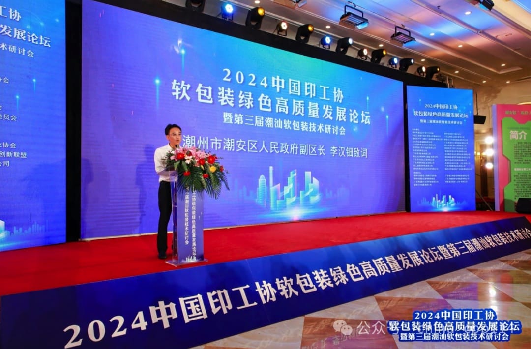 7月15日,為促進包裝產業綠色高質量發展,在預制菜等軟包裝領域的更廣泛應用和發展,推動新技術在軟包裝產業鏈上更快、更好地融合,由中國印刷及設備器材工業協會、潮州市潮安區人民政府指導,中國印工協軟包裝印刷分會、中國印工協VOCs治理專業委員會、廣東省包裝技術協會共同主辦,潮州市潮安區外貿行業協會、廣東汕樟輕工股份有限公司、陜西北人印刷機械有限責任公司、中國惠普有限公司等20家單位共同協辦的2024中國印工協軟包裝綠色高質量發展論壇暨第三屆潮汕軟包裝技術研討會在潮州潮安區庵埠鎮富臨大酒店圓滿舉辦。