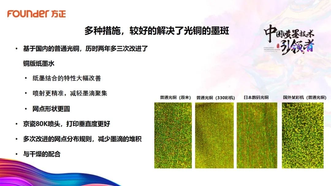 這款設(shè)備基于國內(nèi)的普通光銅改進(jìn)了銅版紙墨水,光銅堆墨造成的墨斑大幅減輕;同時(shí),墨滴噴射更精準(zhǔn),減輕了因偏針引起的拉絲,網(wǎng)點(diǎn)形狀更圓、網(wǎng)點(diǎn)擴(kuò)大率更小。此外,還進(jìn)一步改進(jìn)了網(wǎng)點(diǎn)的分布規(guī)則,減輕了墨斑和拉絲情況。