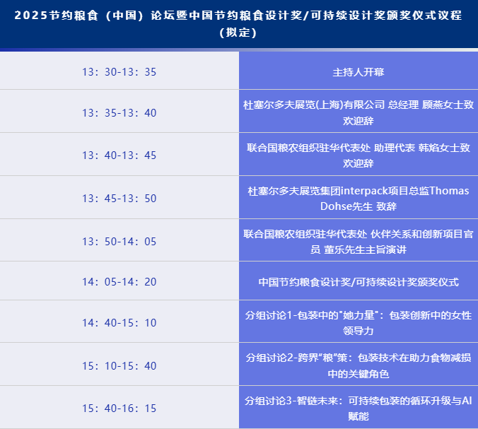 同期,由杜塞爾多夫展覽集團(tuán)聯(lián)合世界包裝組織(WPO)、聯(lián)合國(guó)糧食及農(nóng)業(yè)組織(糧農(nóng)組織)、聯(lián)合國(guó)工業(yè)發(fā)展組織(UNIDO)共同主辦的中國(guó)節(jié)約糧食設(shè)計(jì)獎(jiǎng)和可持續(xù)設(shè)計(jì)獎(jiǎng)評(píng)選活動(dòng),將在論壇期間舉辦頒獎(jiǎng)儀式。